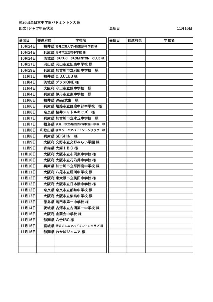第26回全日本中学生バドミントン選手権大会の大会記念TシャツおよびロングTシャツの予約販売を弊社にて承ります。